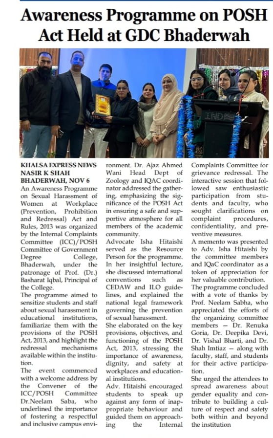 Govt. Degree College Bhaderwah was established in the year 1955 when Mr.Bakshi Ghulam Mohammed , the then Prime Minister of the J&K state laid the foundation of the College.The College was started with few subjects of Science and Arts.It got recognized by the U.G.C in August 1955 under section 2F & 12B of U.G.C act,when U.G.C itself was established.Initially the College started with 52 students on its roll and now its strength has risen to 1200.The Govt. Degree College Bhaderwah is managed by the department of Higher education,Govt. of J&K.At present the College is imparting education in the subjects like Science, Arts, Commerce, Economics, Computer Sciences, Electronics and Literature.Apart from this the College has been upgraded in the year 2004 to level of P.G and is offering Master Degree in Chemistry and Urdu.