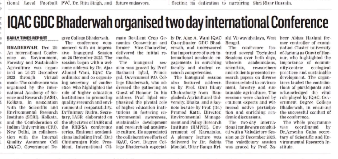 Govt. Degree College Bhaderwah was established in the year 1955 when Mr.Bakshi Ghulam Mohammed , the then Prime Minister of the J&K state laid the foundation of the College.The College was started with few subjects of Science and Arts.It got recognized by the U.G.C in August 1955 under section 2F & 12B of U.G.C act,when U.G.C itself was established.Initially the College started with 52 students on its roll and now its strength has risen to 1200.The Govt. Degree College Bhaderwah is managed by the department of Higher education,Govt. of J&K.At present the College is imparting education in the subjects like Science, Arts, Commerce, Economics, Computer Sciences, Electronics and Literature.Apart from this the College has been upgraded in the year 2004 to level of P.G and is offering Master Degree in Chemistry and Urdu.