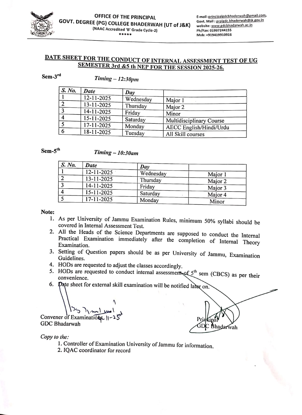 Datesheet for the conduct of Internal Assesment of U.G SEMESTER 3RD AND 5TH for the Session 2025-26